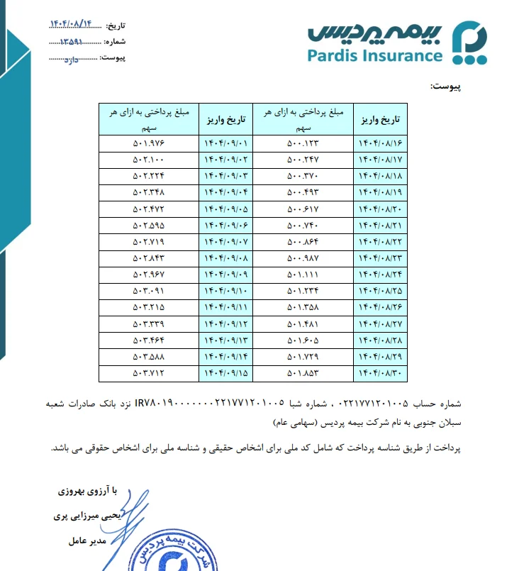 توفیق اقتصادی: شرکت بیمه پردیس (سهامی عام) با انتشار اطلاعیه‌ای رسمی، جزئیات زمان‌بندی و مبالغ پرداخت وجه تعهدی سهام سهامداران را اعلام کرد. بر اساس این اطلاعیه که به امضای «مجتبی میرزایی‌بری» مدیرعامل شرکت رسیده، فرآیند واریز وجوه از ۱۶ آبان ۱۴۰۴ آغاز شده و تا ۱۵ دی‌ماه ۱۴۰۴ ادامه خواهد داشت.