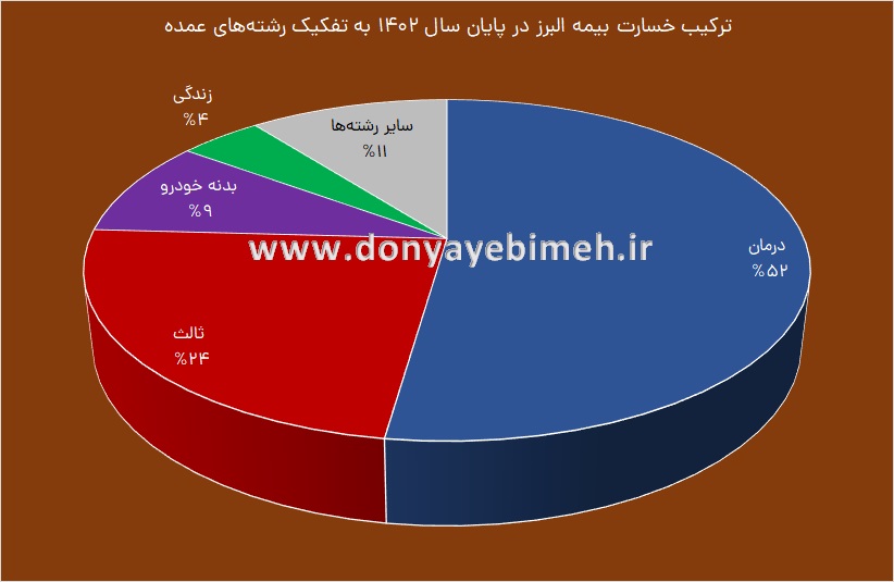 این در حالی است که از مجموع خسارت پرداخت شده توسط بیمه البرز در سال ۱۴۰۲ سهم رشته درمان ۵۲ درصد، سهم بیمه شخص ثالث و حوادث سرنشین ۲۴ درصد، سهم بیمه بدنه خودرو ۹ درصد و بیمه زندگی ۴ درصد و سایر رشتههای بیمه ۱۱ درصد برآورد شده است.
