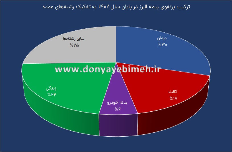 بررسی دنیای بیمه نشان میدهد که از کل فروش بیمه البرز در سال گذشته ۳۰ درصد به رشته بیمه درمان، ۱۷ درصد به رشته شخص ثالث و حوادث سرنشین، ۶ درصد به رشته بیمه بدنه خودرو، ۲۲ درصد به رشته بیمههای زندگی و ۲۵ درصد به سایر رشتهها اختصاص داشته است.