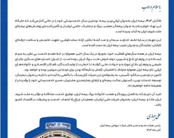توفیق اقتصادی :متن پیام تبریک مدیرعامل بیمه ایران مناسبت نودمین سالگرد تأسیس بدین شرح است: ایرانیان عزیز، همکاران، نمایندگان، بیمهگزاران و مشتریان وفادار و گرانقدر بیمه ایران با سلام و ادب ۱۵ آبان ۱۴۰۴، بیمه ایران بهعنوان ایرانیترین بیمه، نودمین سال خدمترسانی خود را در حالی آغاز میکند که جایگاه این نهاد خوشنام به […]